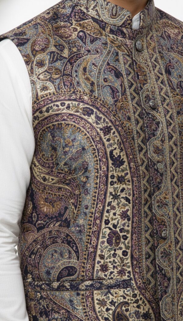 Inspired by traditional craftsmanship, this Premium Kani Waist Coat by Zibreqaan is made from finely woven fabric that delivers both comfort and sophistication. The structured silhouette and intricate texture make it a standout piece for weddings, celebrations, and cultural gatherings. A perfect blend of heritage design and contemporary tailoring.